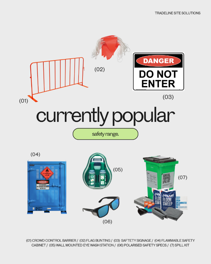 From bold, head-turning signage that doesn’t just catch the eye but spells out safety with authority, to rapid-response spill kits, bollards for every application, and barriers built for the grit and grind of the worksite — Tradeline is your partner in delivering not just supplies, but the confidence that your people, your project, and your reputation are always protected.